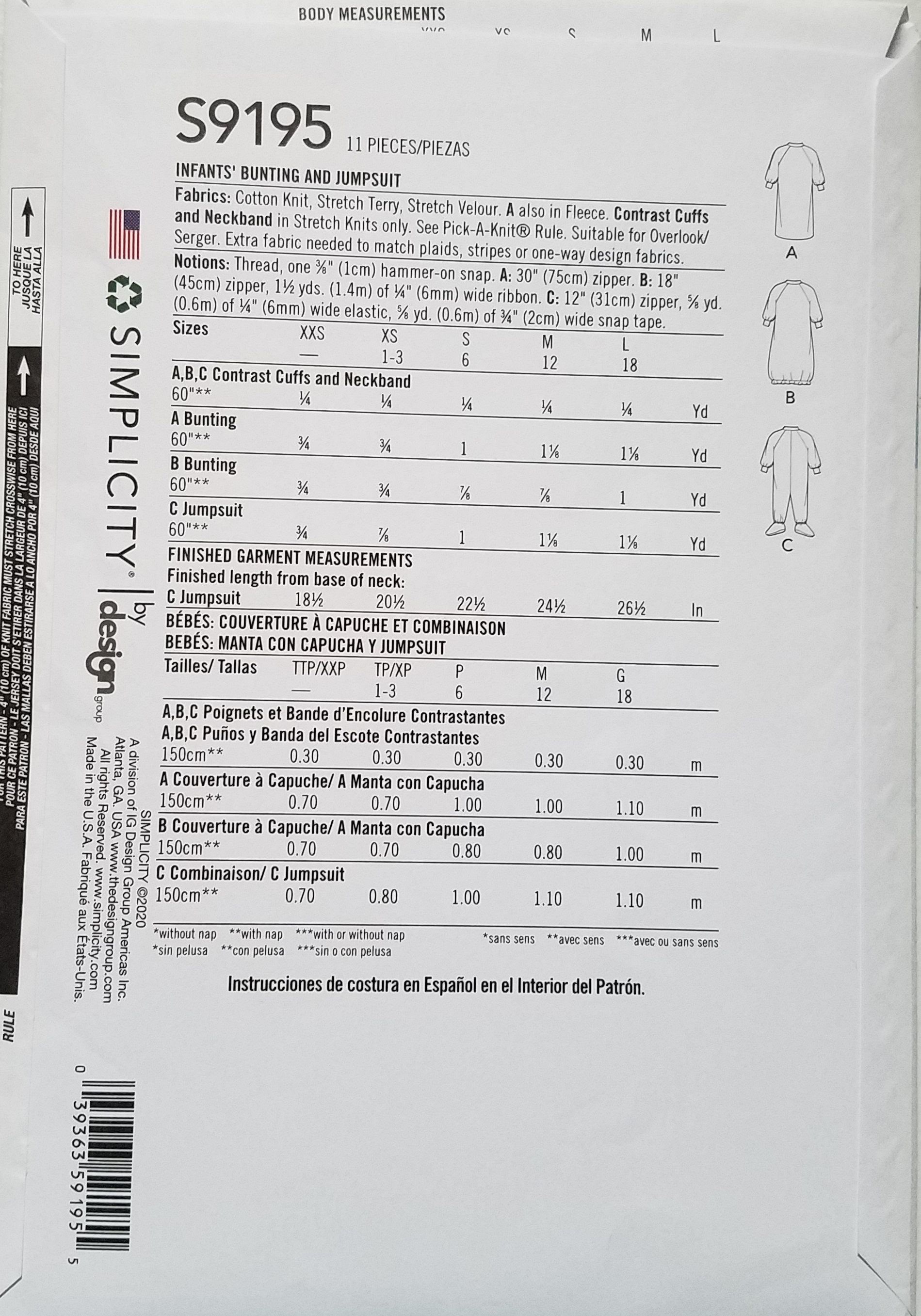 Simplicity Sewing Pattern S9195 Infants Bunting Etsy De